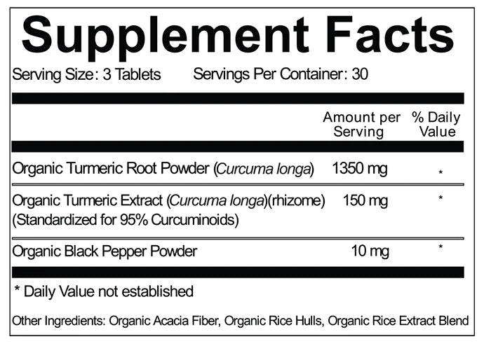 Our formulation is simple. We include the most important ingredients in our Turmeric Tablet, including Organic Turmeric Extract with a high level of curcuminoids. We then combine this with Organic Turmeric Powder, and of course, Organic Black Pepper to help with absorption.