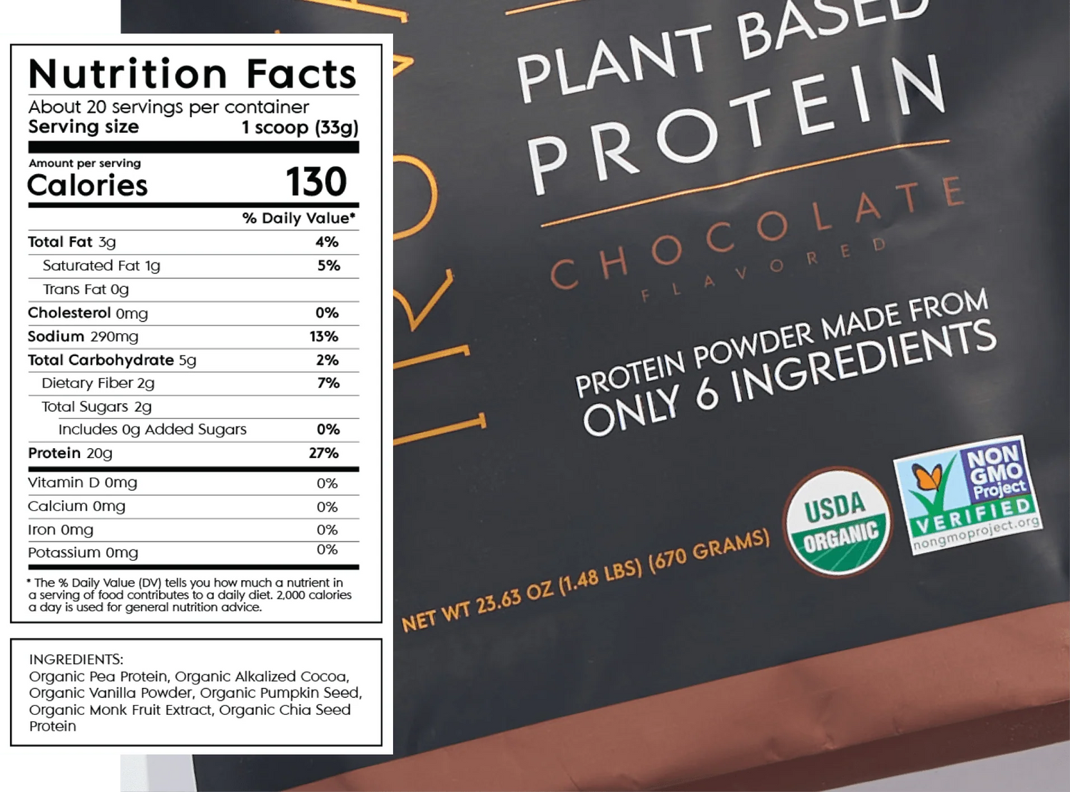 Ingredients: Organic Pea Protein, Organic Alkalized Cocoa, Organic Vanilla Powder, Organic Pumpkin Seed, Organic Monk Fruit Extract, Organic Chia Seed Protein.